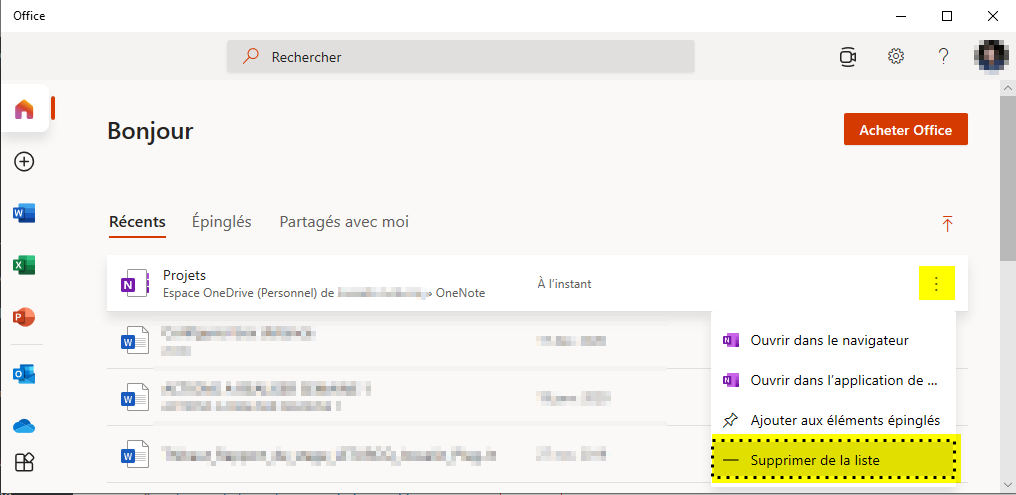 Sur votre poste ouvrez l’application Office. Puis sélectionner le bloc-note à supprimer et cliquer sur Supprimer de la liste.