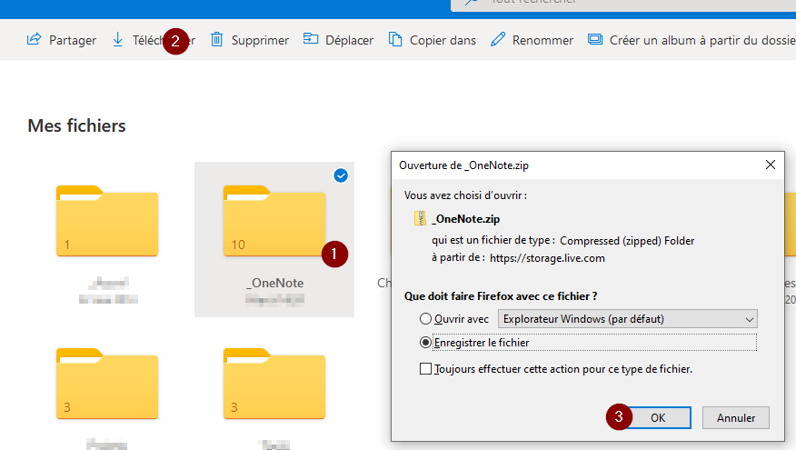 Une façon simple de faire un backup do vos bloc-notes OneNote est de vous rendre sur votre OneDrive via le web et de télécharger le dossier où se trouvent vos bloc-notes.