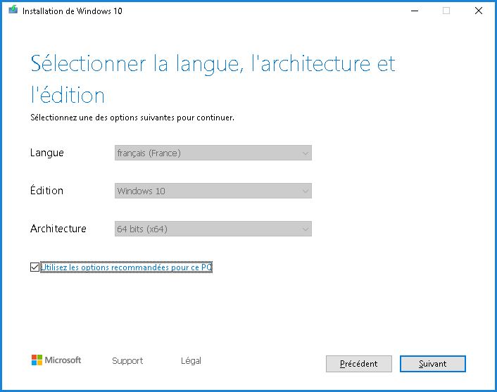 Sélectionner la langue, l’architecture et l’édition. Puis cliquez sur Suivant.