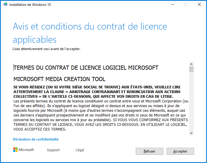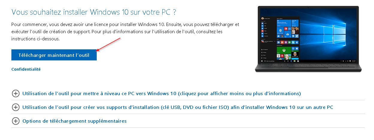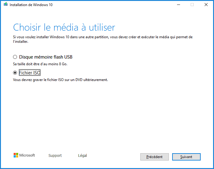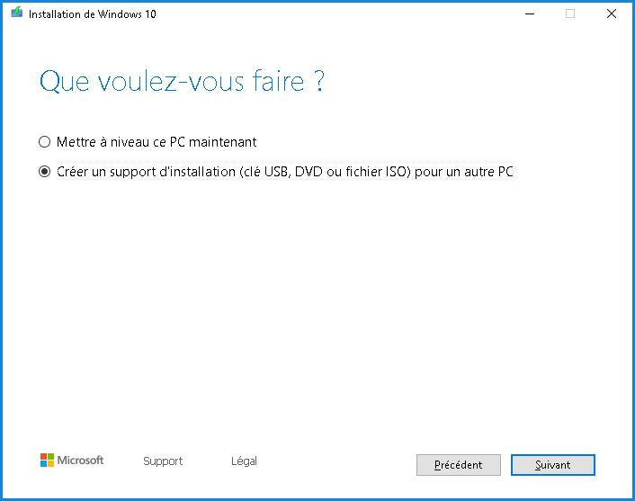 Microsoft met à disposition un utilitaire (MediaCreationTool.exe) afin de permettre de télécharger le fichier ISO de Windows 10.