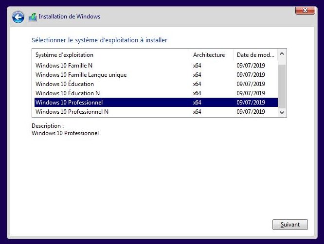 Sélectionnez la version de Windows que vous souhaitez installer. Ici nous choisissons Windows 10 Professionnel. (la version N est la version sans Media Player et risque de poser problème dans certains cas).